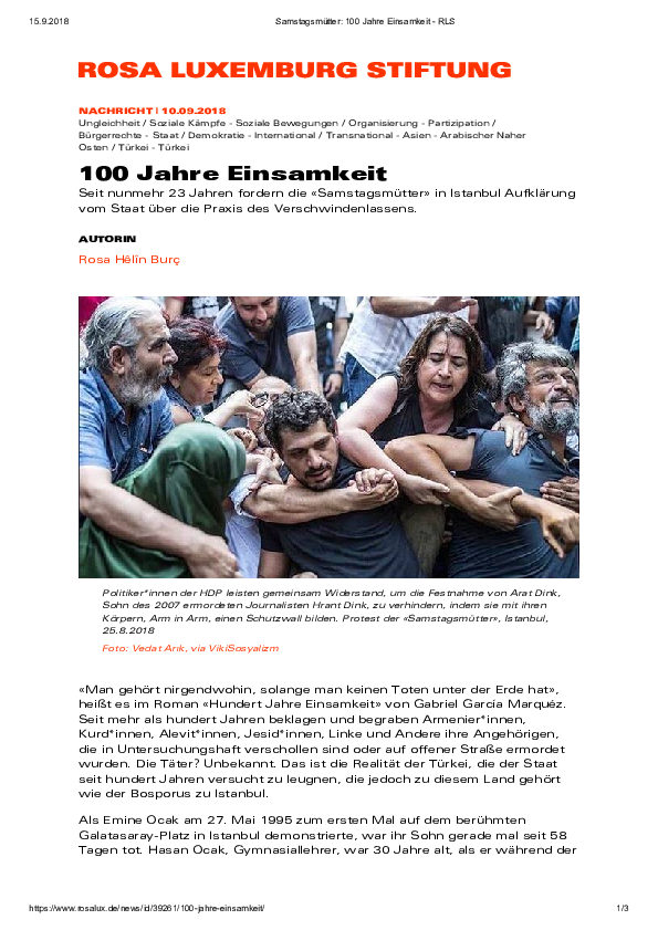 PDF) Samstagsmütter: 100 Jahre Einsamkeit, Rosa Luxemburg Stiftung / Türkei-Dossier | Rosa Burc - Academia.edu