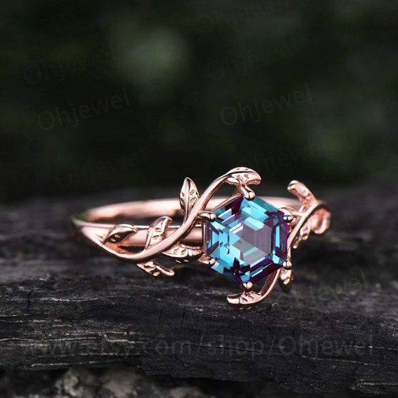 Alexandrite Engagement Ring, Nature Inspired Engagement Ring, Lab Alexandrite Ring, Moissanite Ring, Rose Gold Ring for Women, Art Nouveau - Etsy