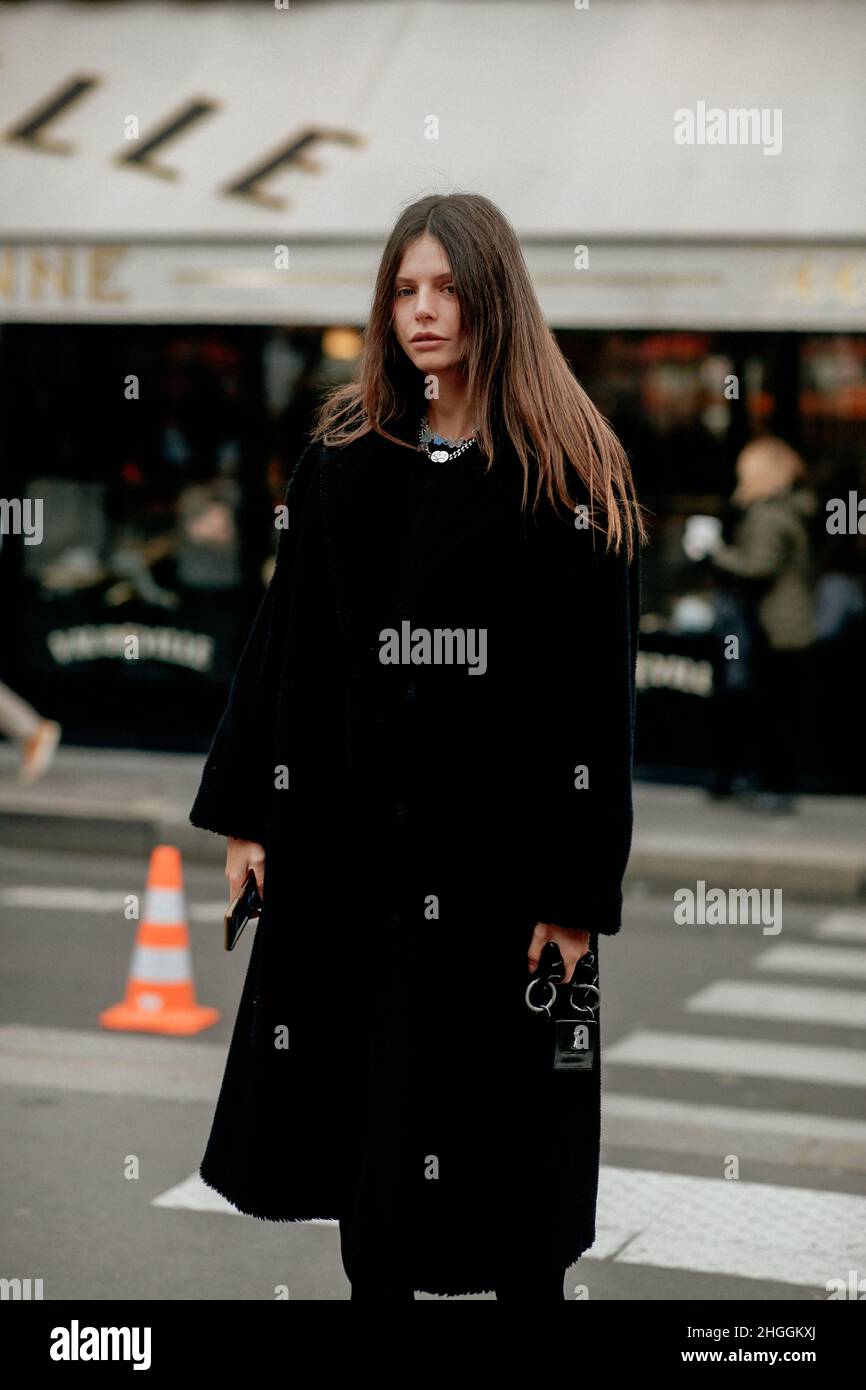 Paris, France. 19th Jan, 2022. Street style, Alizee Gamberini arriving at Ami Fall-Winter 2022-2023 Menswear show, held at Palais Brongniart, Paris, France, on January 19th, 2022. Photo by Marie-Paola Bertrand-Hillion/ABACAPRESS.COM Credit: Abaca