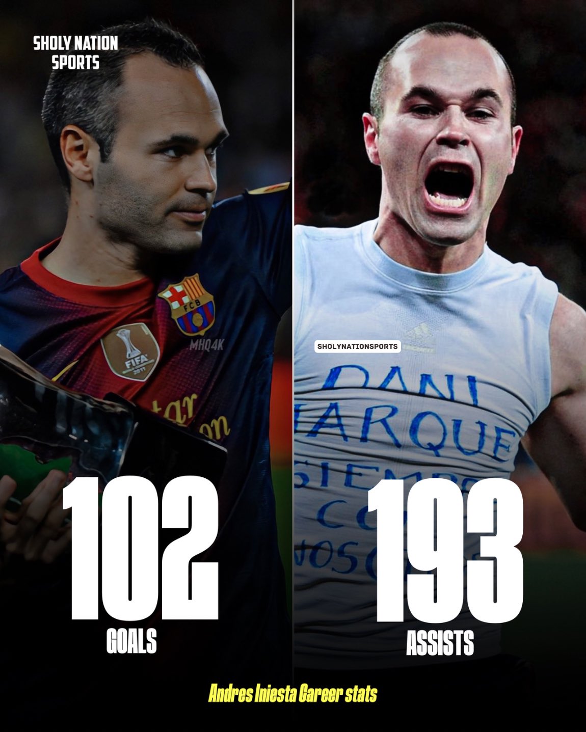 Sholy Nation Sports on X: "🇪🇸 Andres Iniesta career stats: 👕 970 games ⚽️ 102 goals 🎯 193 assists 🤝 295 goal contributions 🏆 37 trophies ⭐️ 54 individual achievements; ⭐️4X IFFHS