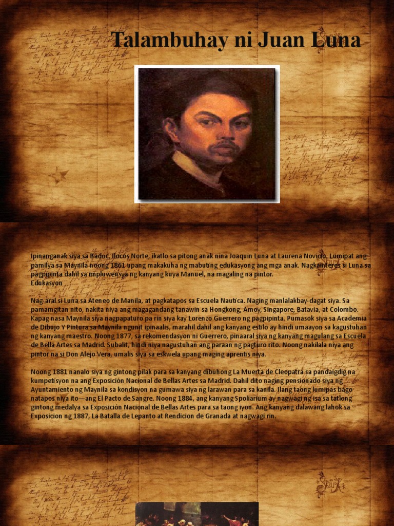 Iniibig kong Pilipinas - Juan N. Luna (1857-1899) Dakilang Pintor Si juan Luna ay ipinanganak sa Badoc, Ilocos Norte noong Oktubre 23, 1857, kapatid niya si Antonio Luna. Ang mga magulang nila