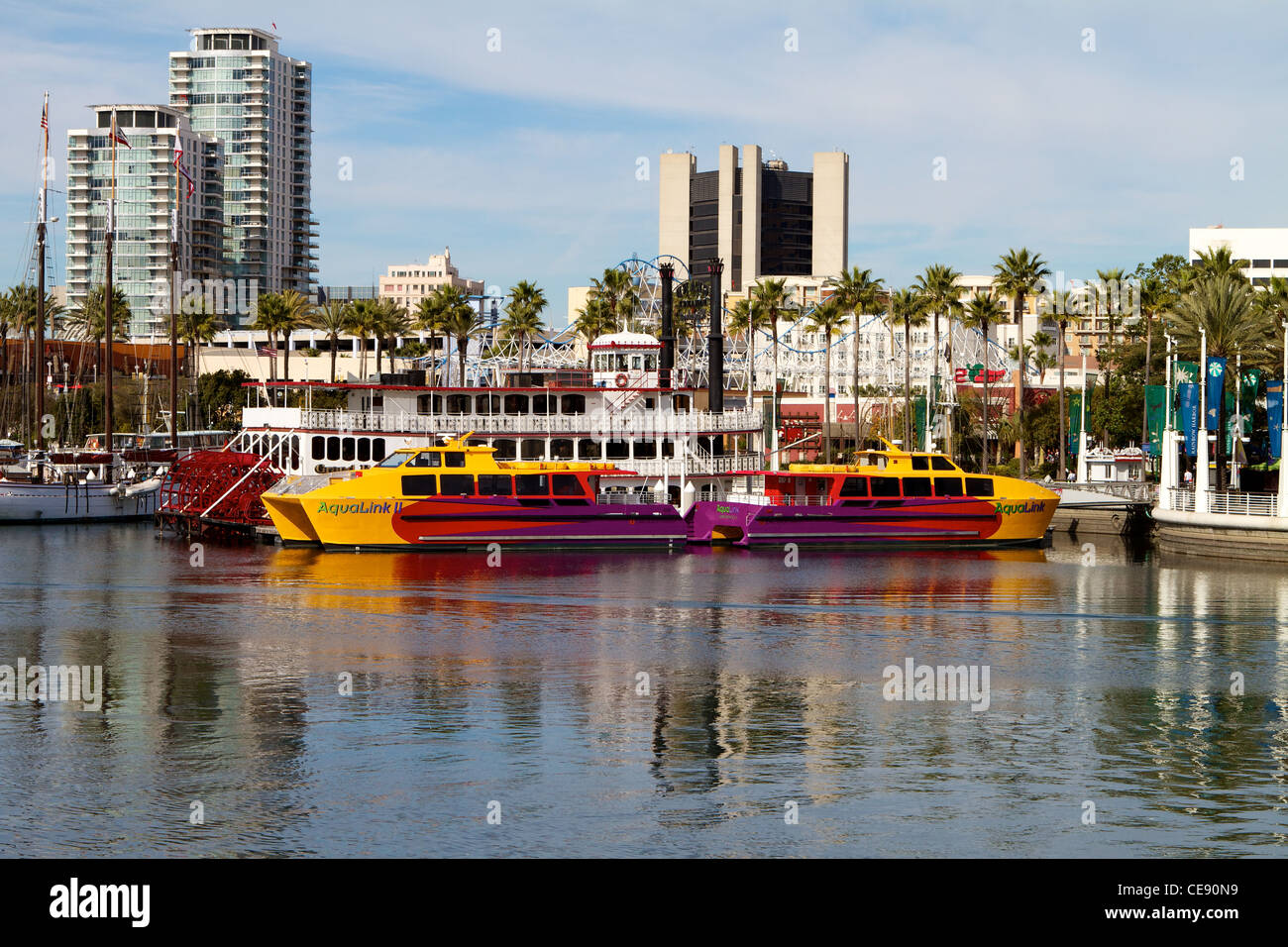 Aquabus and Aqualink Watertaxi a Long Beach Transit Catermaran and the Long Beach Skyline and San Pedro Bay California USA Stock Photo - Alamy