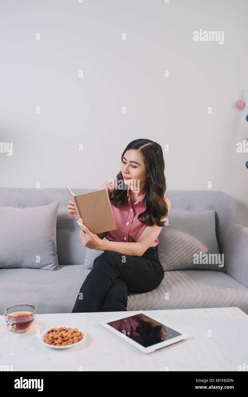 Frau sitzt am Tisch, schreiben im Notebook und trinken Kaffee in schönes Licht Home Interior. Zu Hause arbeiten. Freelancer. Schreiben Sie Ideen Stockfotografie - Alamy