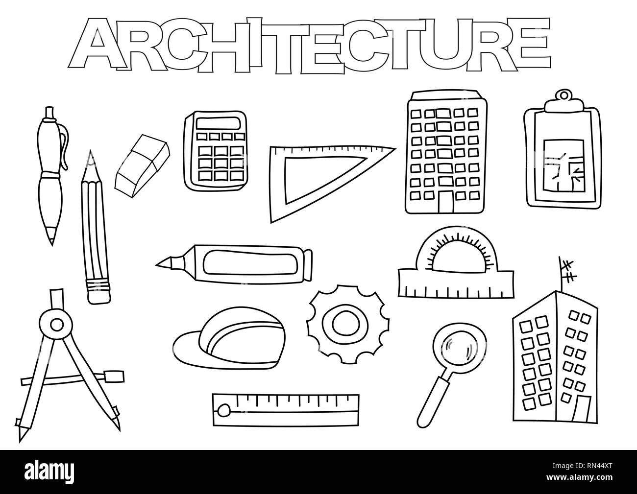 ARCHITEKTUR, SVG Doodle Vektor Icons. Architekt Werkzeuge Gebäude ...