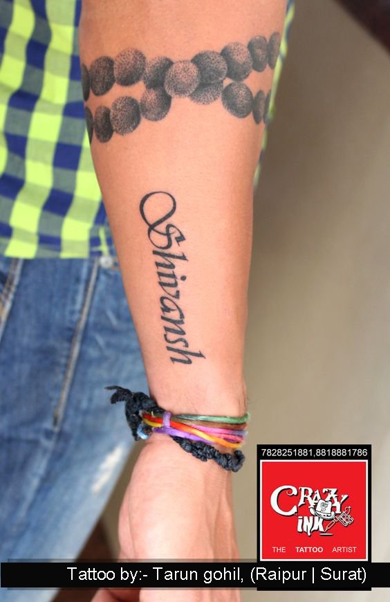 Crazy ink tattoo & Body piercing on X: "Rudraksha armband tattoo & Name tattoo. Done by tattoo artist Tarun gohil. At crazy ink tattoo studio. (Raipur | Surat) #rudrakshatattoo #rudrakshaarmbandtattoo #shivatattoo #shivaarmbandtattoo #