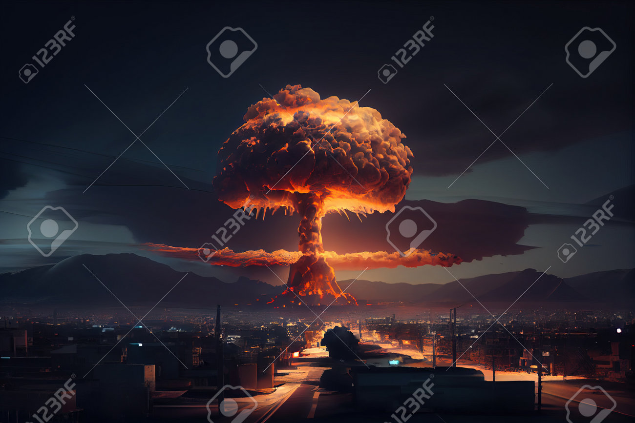 Explosion Einer Atombombe Gegen Stadtbild Bei Nacht 3D-Darstellung Lizenzfreie Fotos, Bilder und Stock Fotografie. Image 204784946.