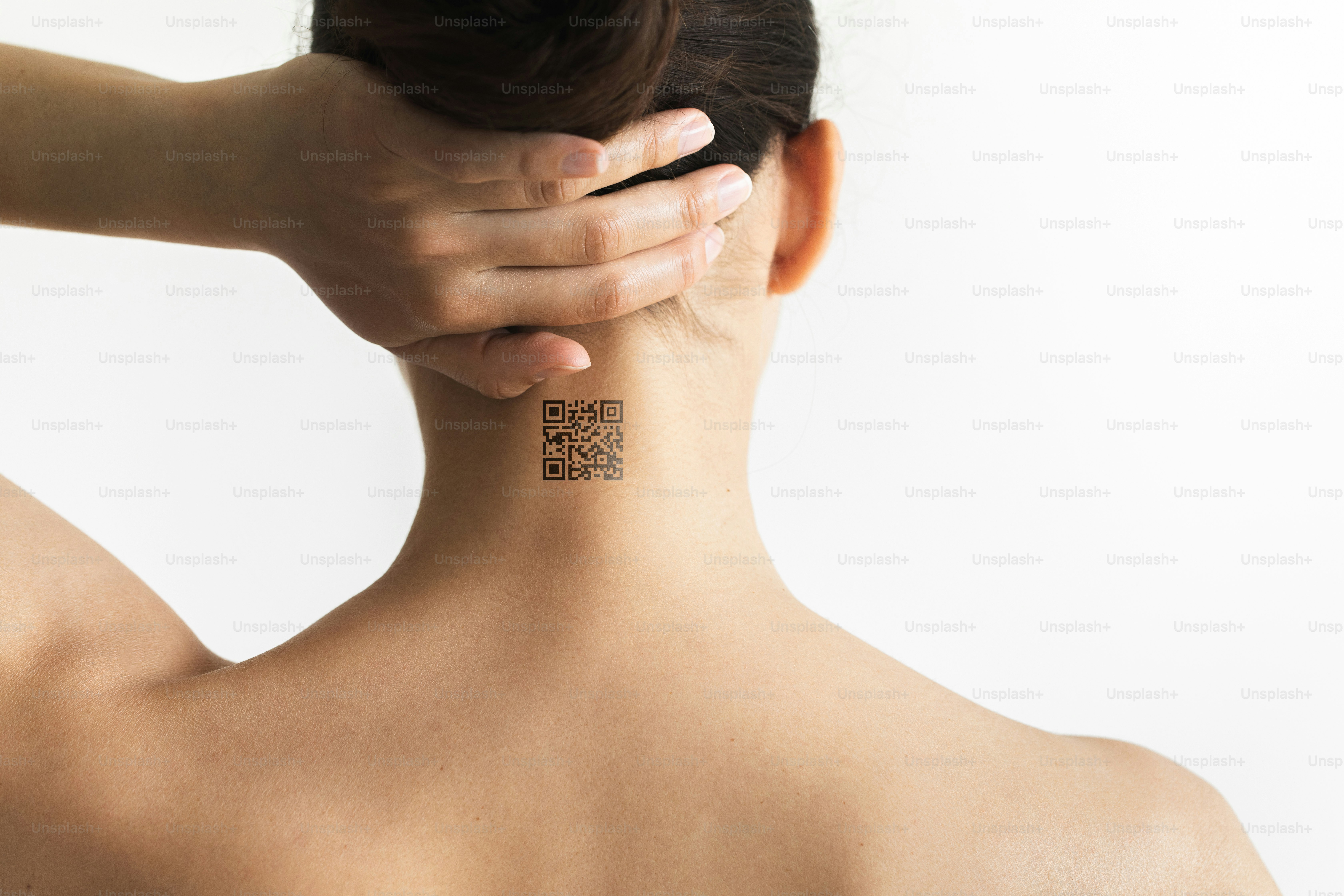 Foto zum Thema Person mit QR-Code am Hals. Zukünftige Technologie der Chipisierung von Menschen zur Beobachtung in der sozialen Krisenzeit des Coronavirus. Einschränkung der Freiheit. – Bild zu QR-Code auf Unsplash