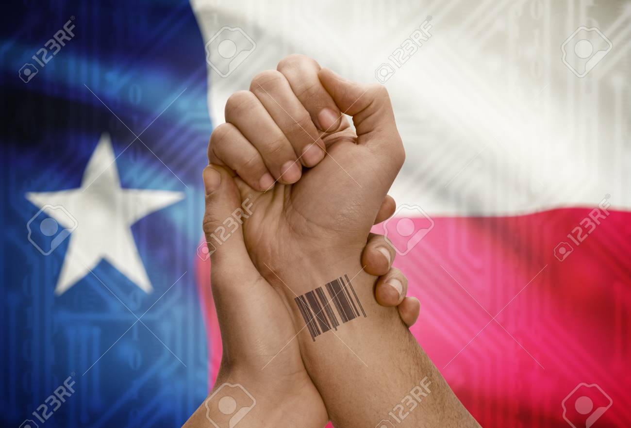 Barcode-ID-Nummer Tattoo Am Handgelenk Der Dunkelhäutigen Person Und USA Staaten Flagge Auf Hintergrund - Texas Lizenzfreie Fotos, Bilder und Stock Fotografie. Image 48067351.