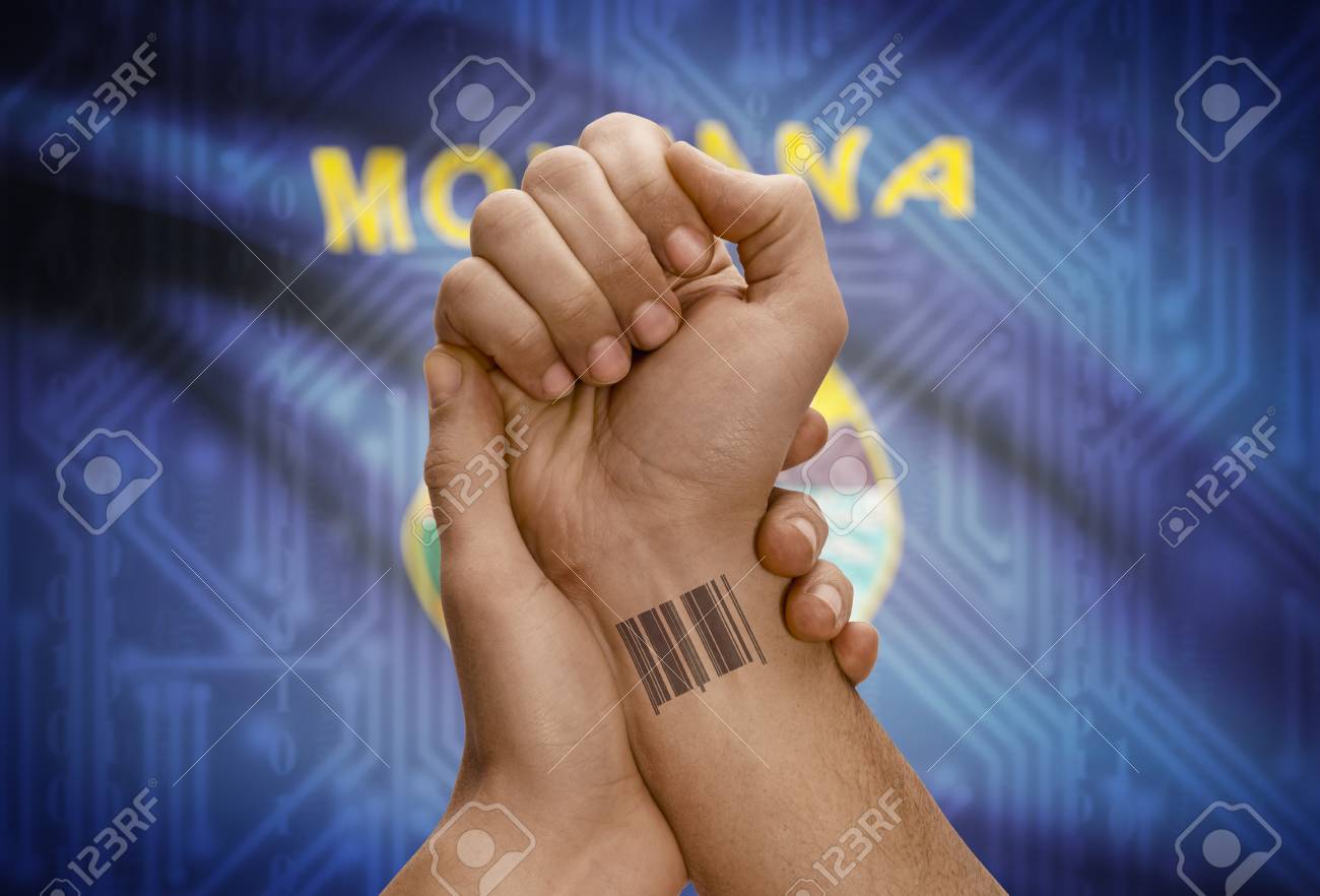 Barcode-ID-Nummer Tattoo Am Handgelenk Der Dunkelhäutigen Person Und USA Staaten Flagge Auf Hintergrund - Montana Lizenzfreie Fotos, Bilder und Stock Fotografie. Image 48067374.