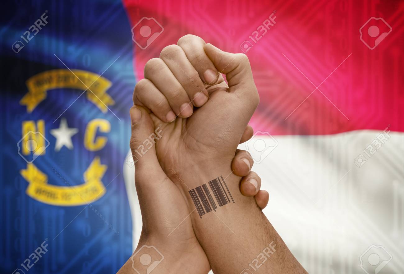 Barcode-ID-Nummer Tattoo Am Handgelenk Der Dunkelhäutigen Person Und USA Staaten Flagge Auf Hintergrund - North Carolina Lizenzfreie Fotos, Bilder und Stock Fotografie. Image 48067501.