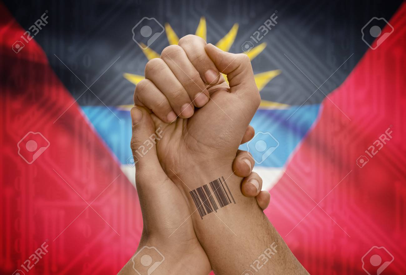 Barcode-ID-Nummer Tattoo Am Handgelenk Der Dunkelhäutigen Person Und Nationalflagge Auf Hintergrund - Antigua Und Barbuda Lizenzfreie Fotos, Bilder und Stock Fotografie. Image 48068990.