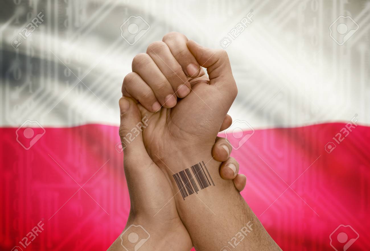 Barcode-ID-Nummer Tattoo Am Handgelenk Der Dunkelhäutigen Person Und Nationalflagge Auf Hintergrund - Polen Lizenzfreie Fotos, Bilder und Stock Fotografie. Image 48070298.