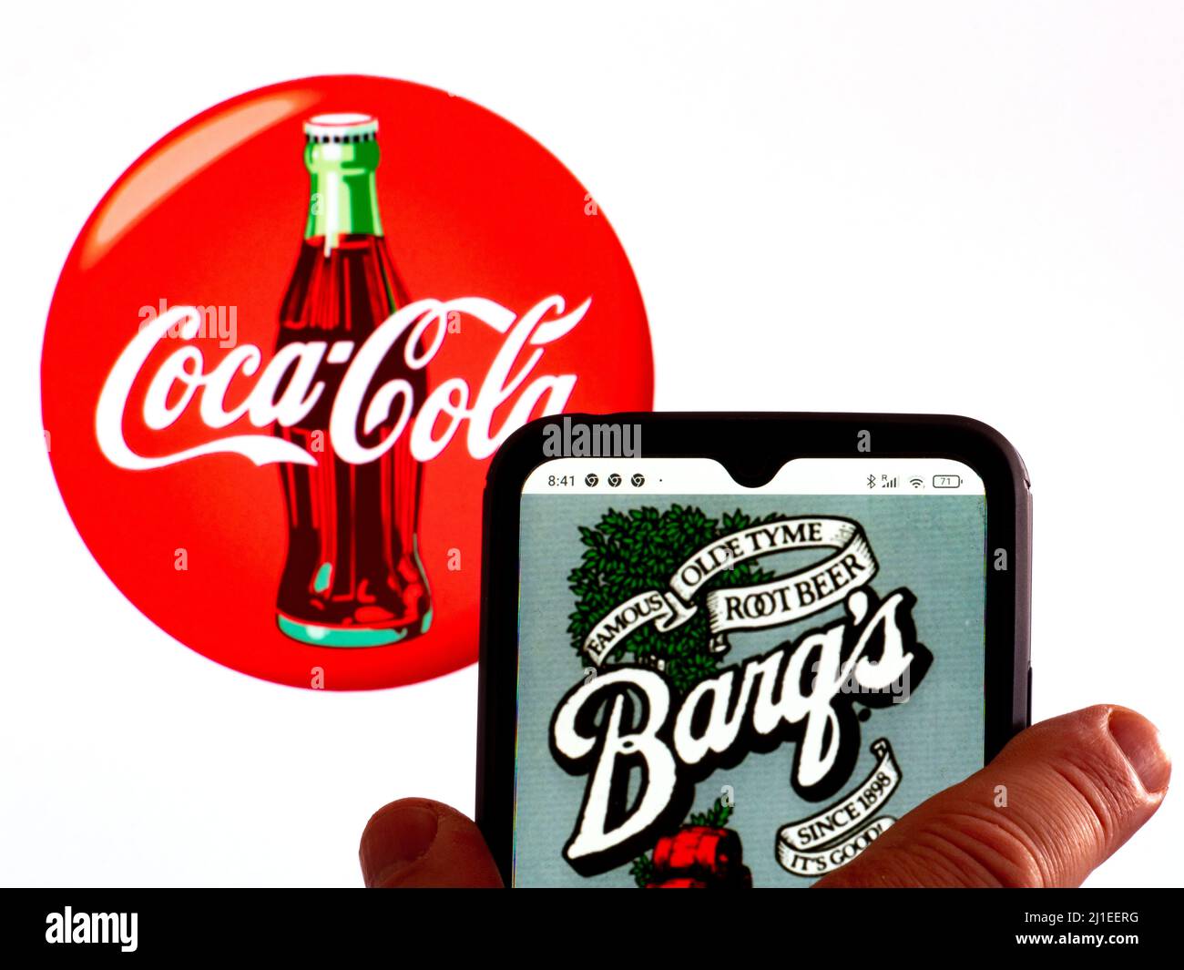 In this photo illustration, the Barq's , root beer logo is displayed on a smartphone screen with a Coca-Cola logo in the background. (Photo by Igor Golovniov / SOPA Images/Sipa USA Stock