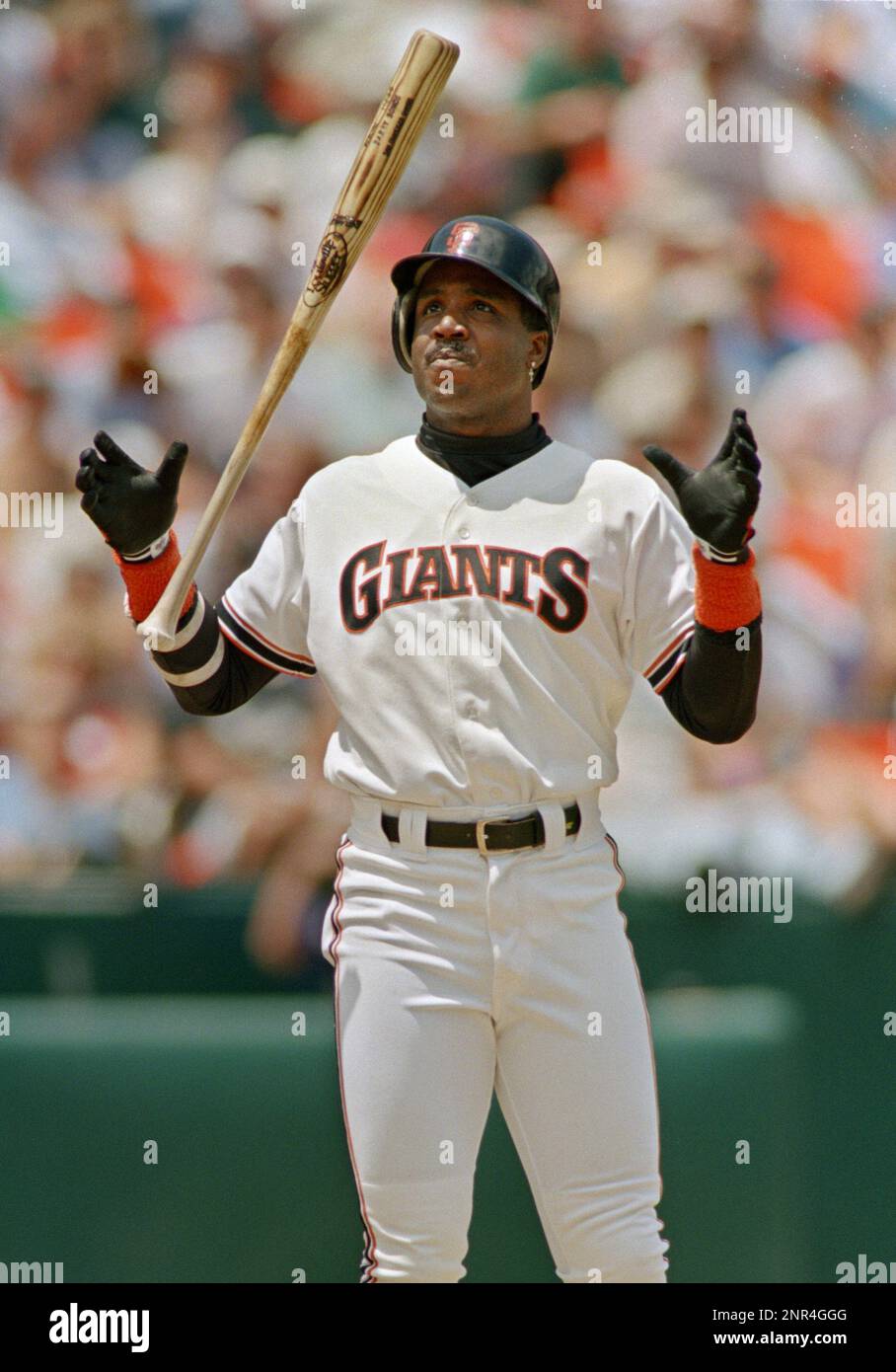 San Francisco Giants outfields Barry Bonds tosses his bat as he gets a strike against the Los Angeles Dodgers at Candlestick Park in San Francisco, California, July, 28, 1993. Bonds, a central