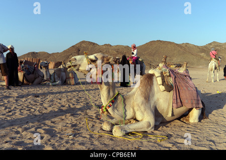 Beduinen als Führer in der traditionellen Kleidung führt Touristen Kamelreiten in der Wüste. Beduinen-Dorf über Hurghada Ägypten Afrika Stockfotografie - Alamy