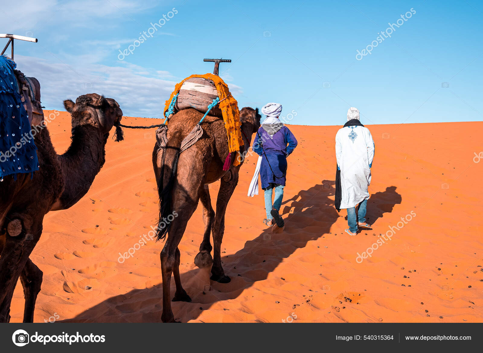 Beduinen mit Kamelkarawane auf Sand in der Wüste gegen den blauen Himmel 5136693 Stock-Photo bei Vecteezy