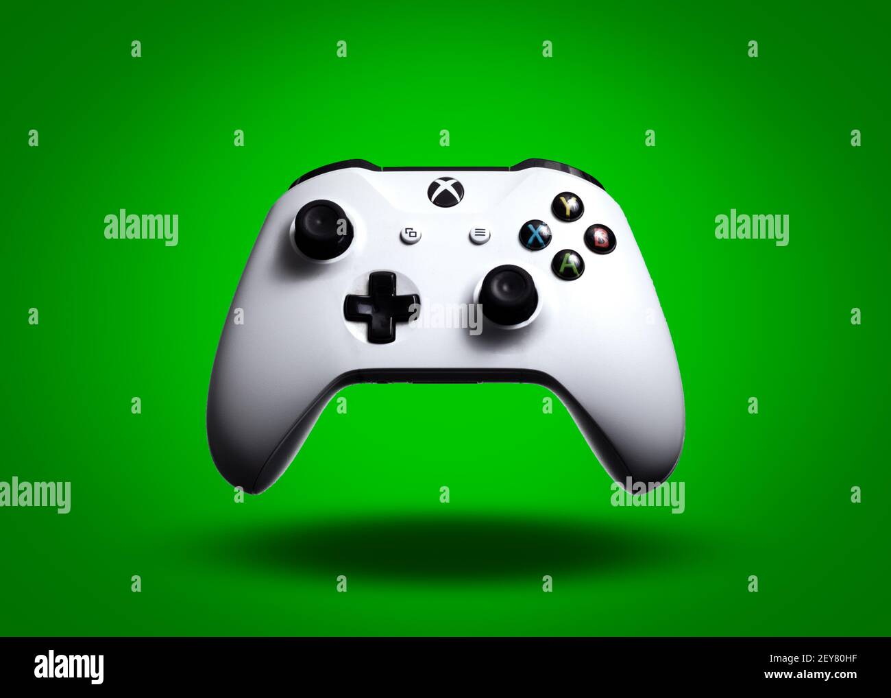 A still life image of an Xbox one controller floating in front of a green background Stock Photo - Alamy