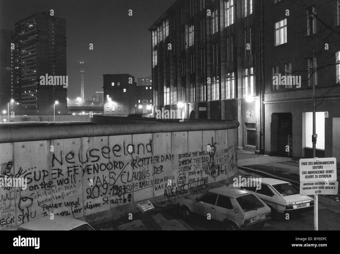 View over the Berlin Wall in 1985, towards the TV Tower at Alexanderplatz in East Berlin, at night, Berlin, Germany, Europe Stock Photo - Alamy