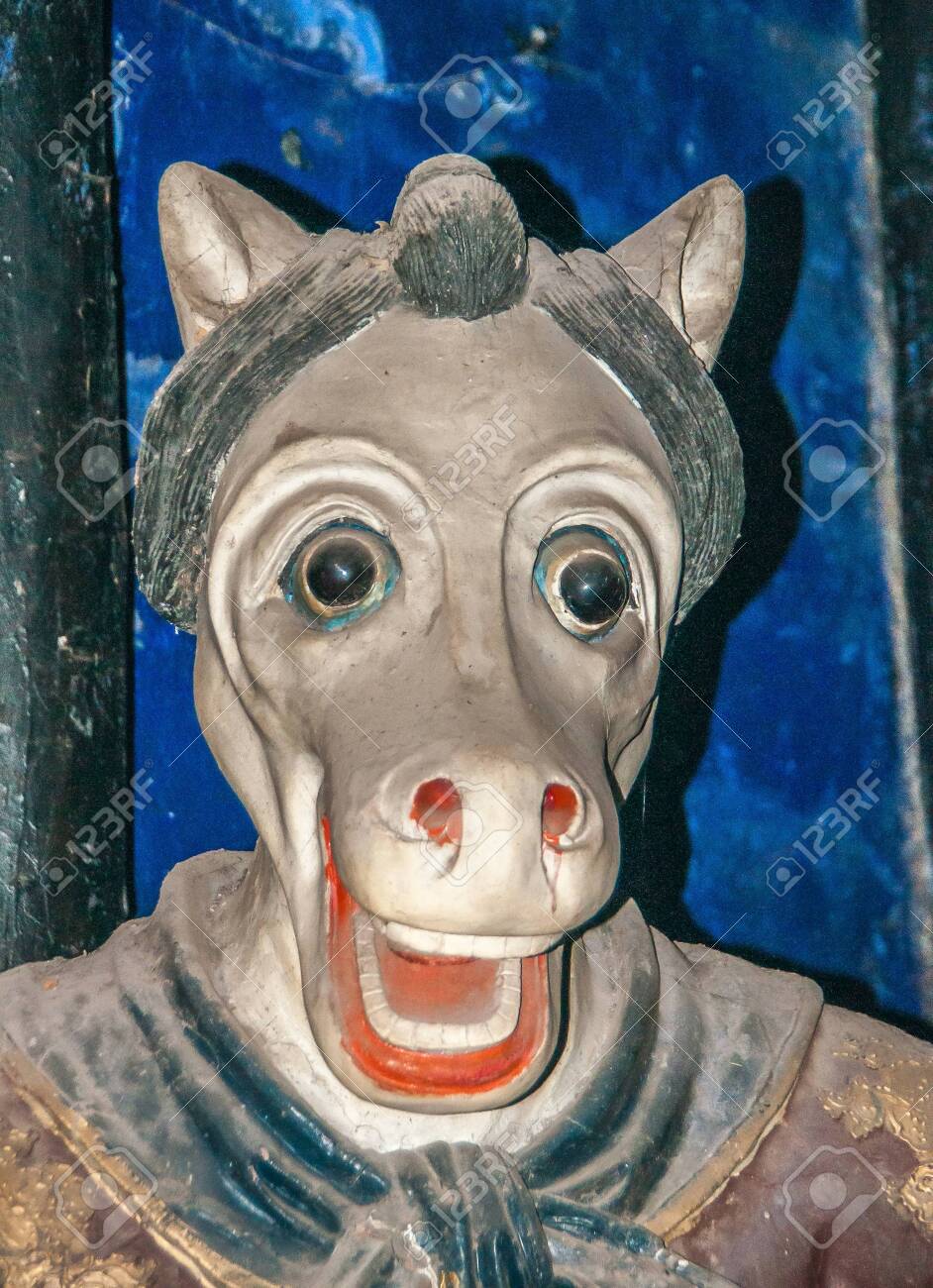 Fengdu, China - 8. Mai 2010: Geisterstadt, Historisches Heiligtum. Nahaufnahme Des Grauen Pferdegesichtes Vor Blauem Hintergrund Als Teil Des Bestrafers In Der Unterwelt Oder Hölle. Lizenzfreie Fotos, Bilder und Stock Fotografie. Image 145185478.