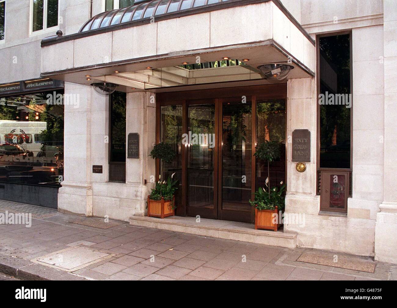 Der Eingang zum Luxus-Wohnblock in der Park Lane, London, wo Dodi Fayed lebt. Die Spekulationen über die Beziehung zwischen Diana, Prinzessin von Wales und dem Chef des Sohnes Harrods, Mohamed Al Fayed,