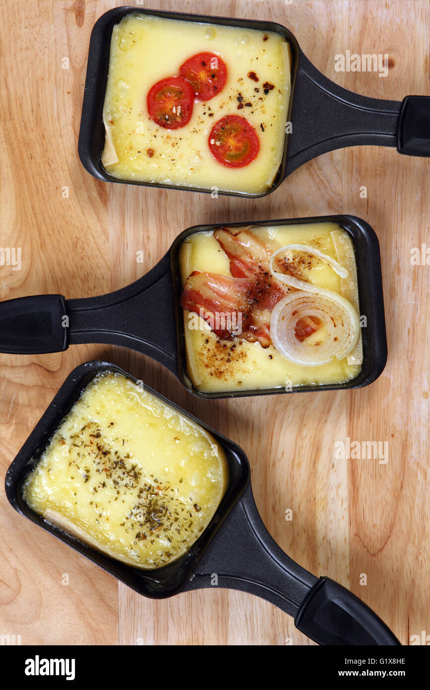 Foto von einem drei Raclette-Tabletts mit geschmolzenem Käse, Kräuter, Kirschtomaten, Speck und Zwiebeln Stockfotografie - Alamy