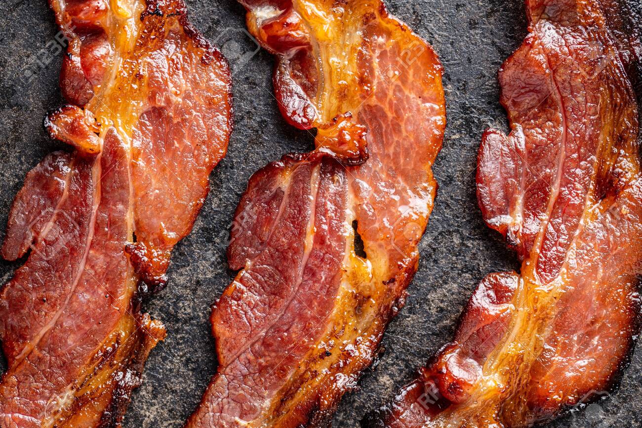 Gebratener Speck. Gebratener Speck In Scheiben Geschnitten Auf Alten Küchentisch. Ansicht Von Oben. Lizenzfreie Fotos, Bilder und Stock Fotografie. Image 140737401.
