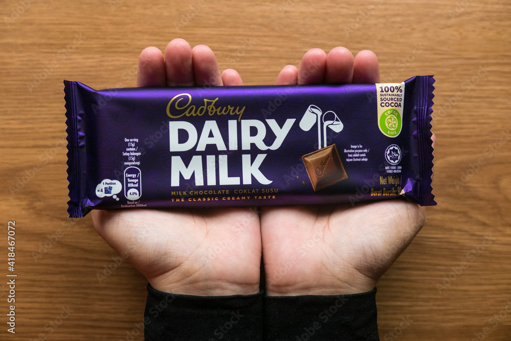 KEDAH,MALAYSIA - MARCH 6TH,2021 : A hand holding Cadbury Dairy Milk chocolate bar. Cadbury Dairy Milk is a brand of milk chocolate manufactured by Cadbury. Stock-Foto | Adobe Stock