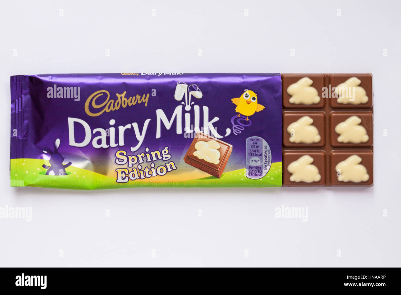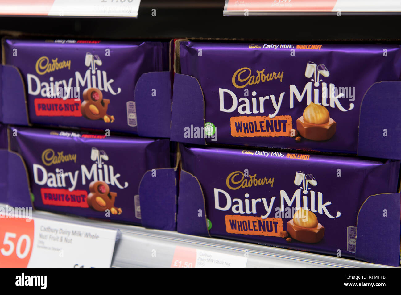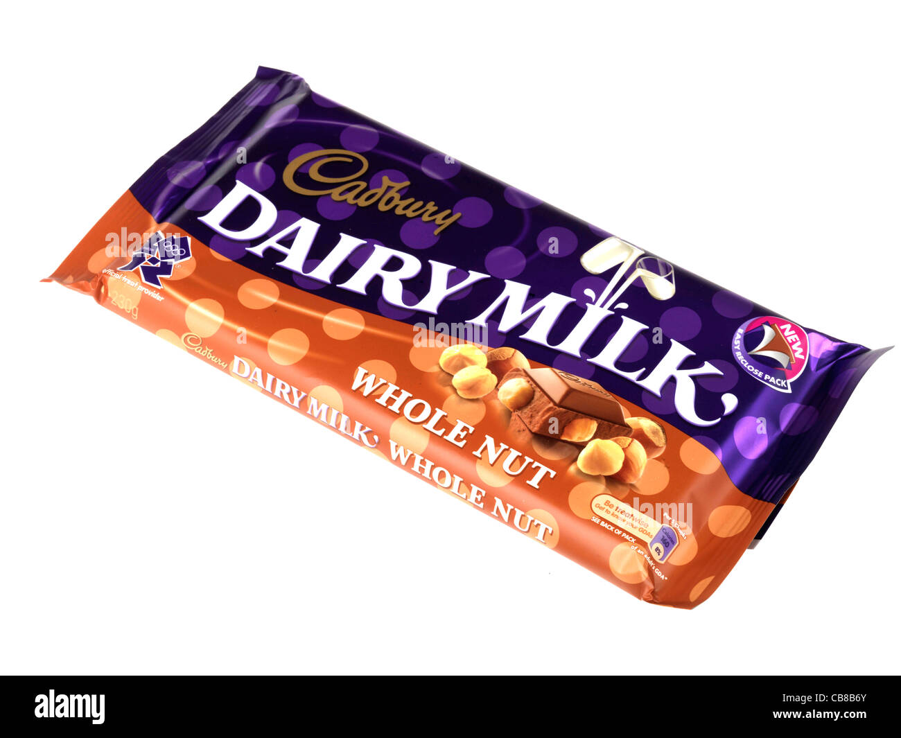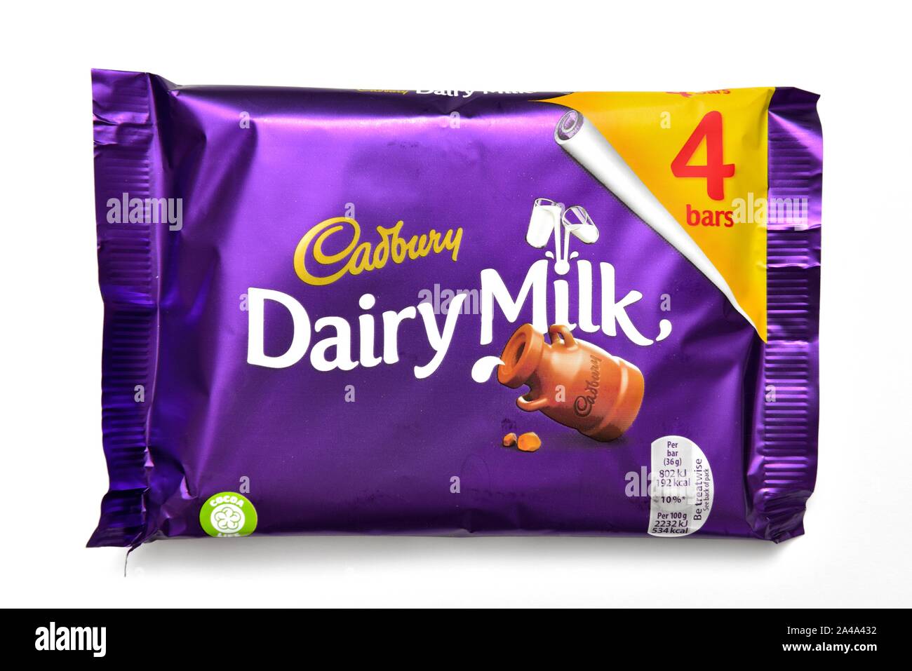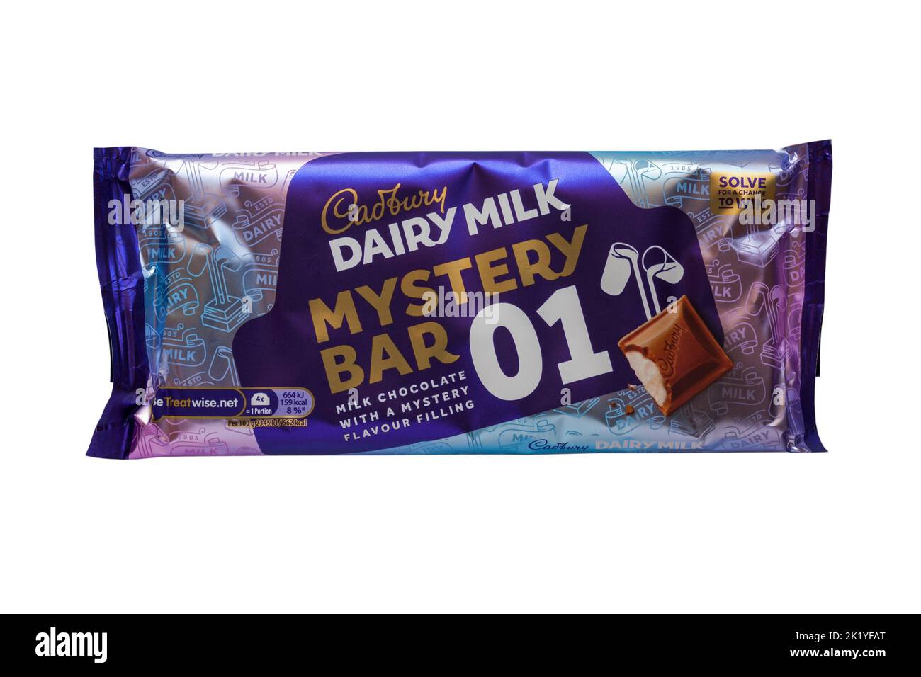 Cadbury Dairy Milk Mystery Bar 01 Milchschokolade mit einem geheimnisvollen, aromatischen Schokoladenriegel, isoliert auf weißem Hintergrund Stockfotografie - Alamy