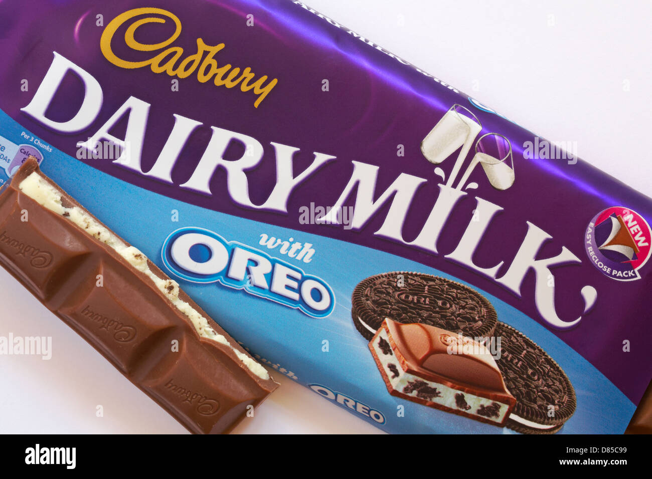 Cadbury Dairy Milk mit Oreo Schokoriegel mit Stück abgebrochen setzen auf weißem Hintergrund Stockfotografie - Alamy