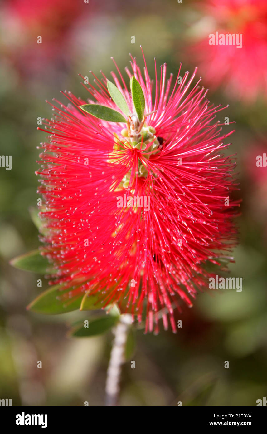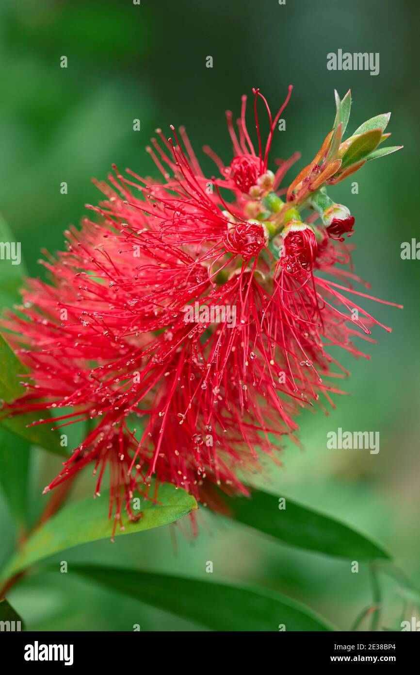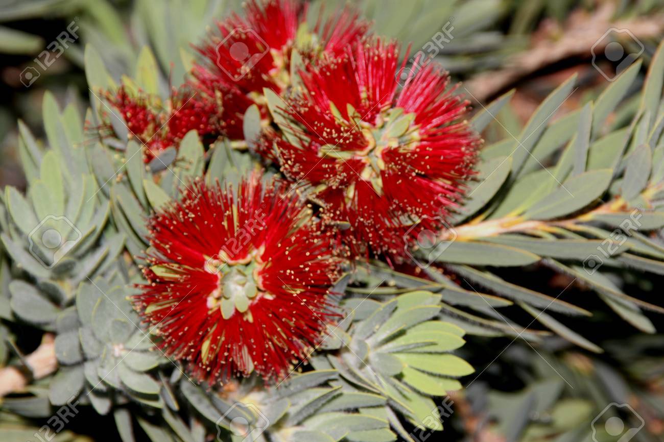 Callistemon Citrinus Kleiner John, Kleiner Zwerg-Flaschenbürste, Niedrigwüchsiger Strauch Mit Kurzen Grün-grünen Blättern Und Kurzen Aufrechten Stacheln Aus Roten Blüten, Beliebte Heckenpflanze. Lizenzfreie Fotos, Bilder und Stock Fotografie. Image ...