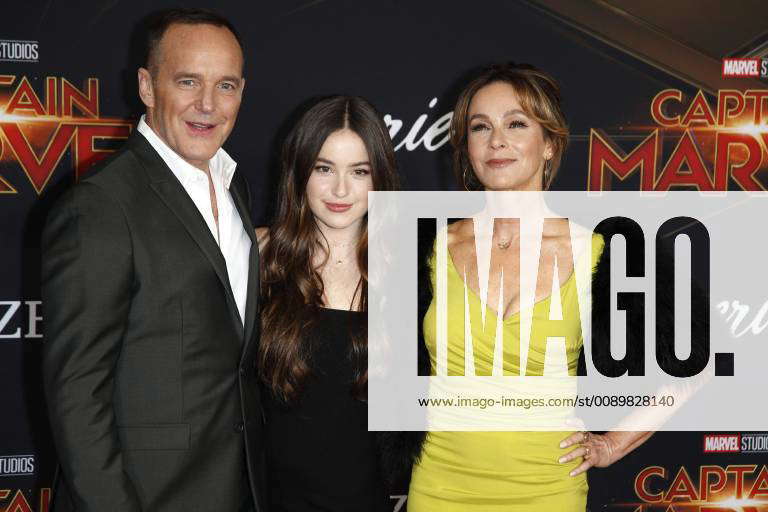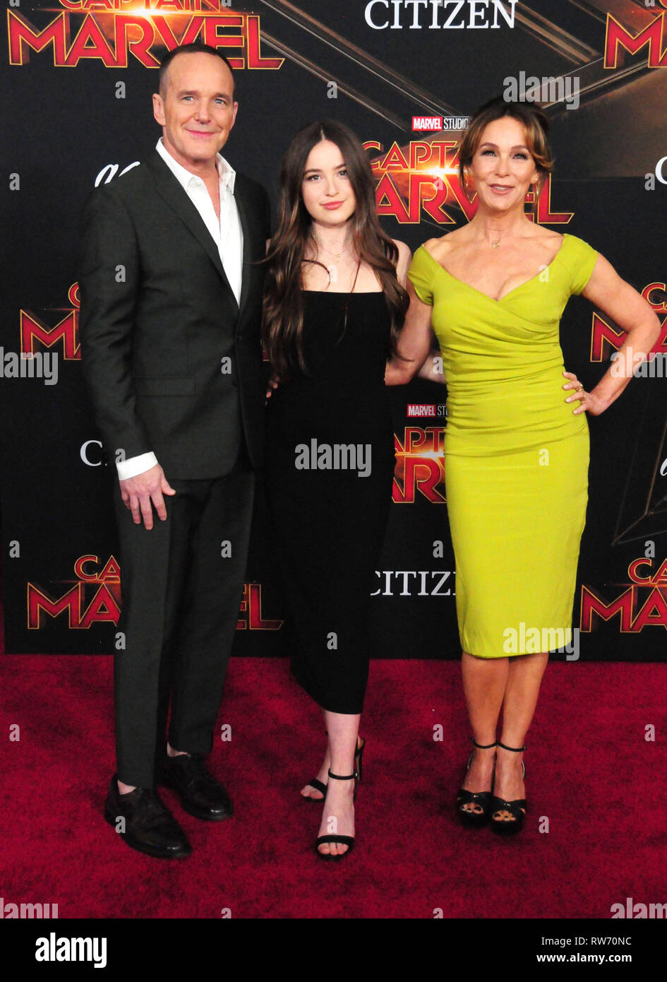 Clark Gregg, his daughter Stella Gregg and his wife Jennifer Grey attending the 'Captain Marvel' world premiere at El Captian Theatre on March 4,2019 in Los Angeles, California Stock Photo - Alamy
