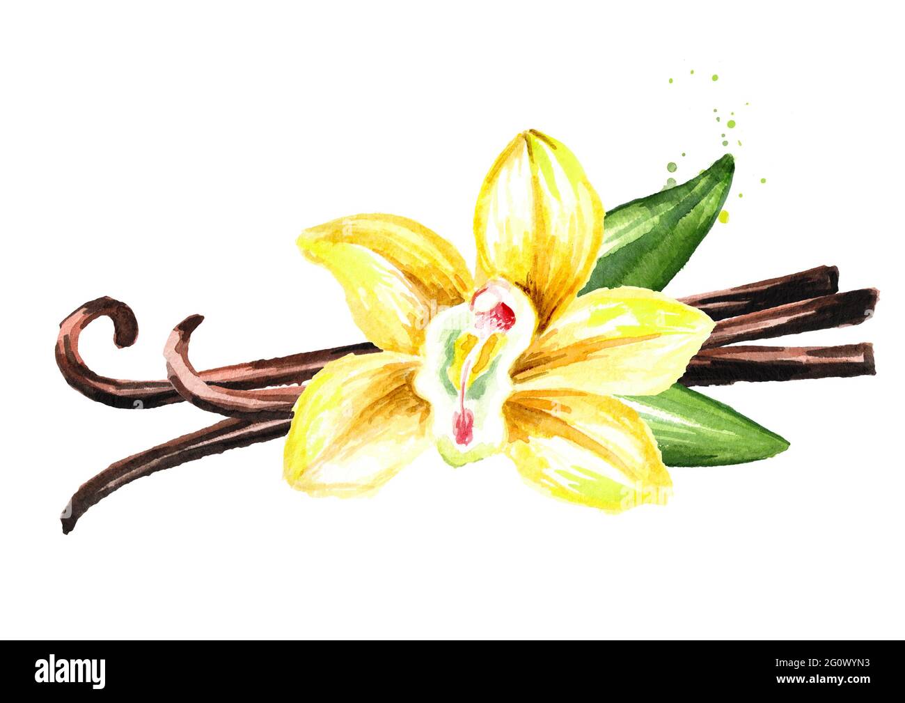 Vanille gelbe Blume, Schoten und Blätter. Aquarell handgezeichnete ...