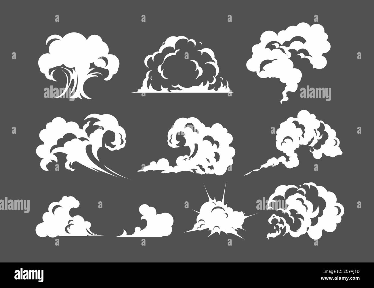 Cartoon Rauchwolke. Weißer Rauch Dampf Explosion Staub Nebel Smog Gas Explosion Staub Spiel Cartoon, Symbol. Nebelflachisoliertes Clipart für Design, Effekte und Stock-Vektorgrafik - Alamy