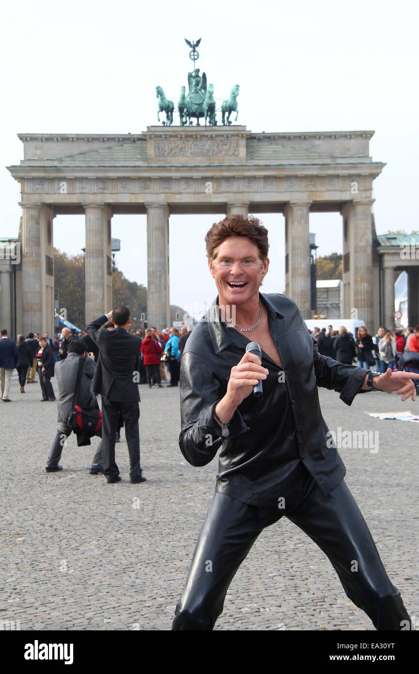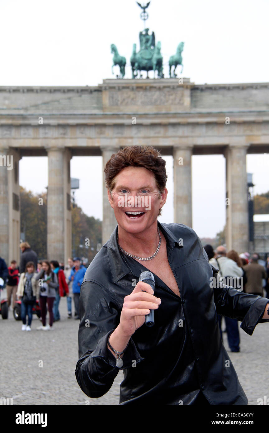 Berlin, Germany. 05th Nov, 2014. The wax figure of US singer David Hasselhoff from Madame Tussauds Vienna stands in front of the Brandenburg Gate in Berlin, Germany, 05 November 2014. The wax
