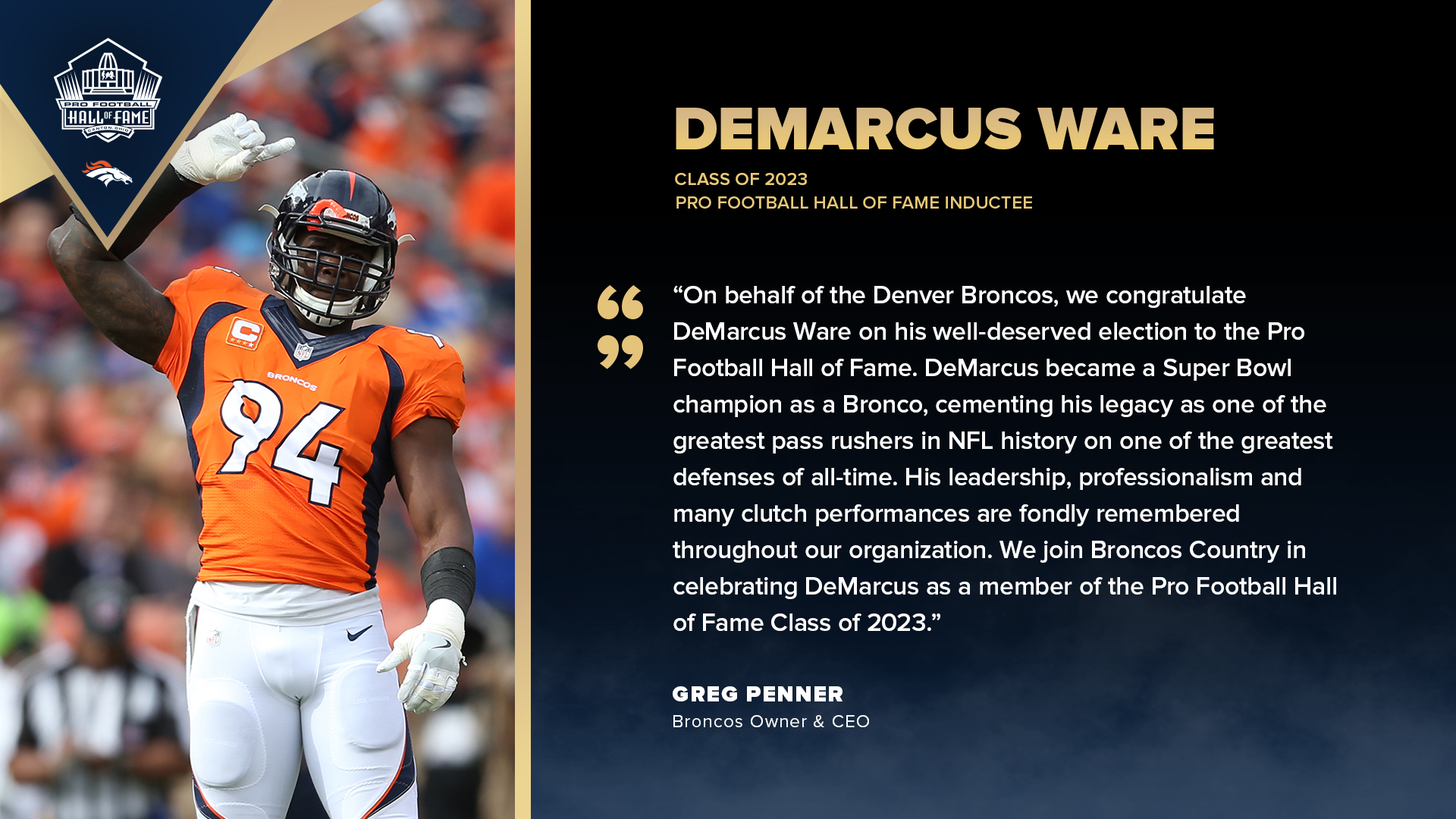 9NEWS Sports Denver on X: "DeMarcus Ware is the newest Broncos legend joining the Pro Football Hall of Fame! 💙🧡 Hear from Ware after he heard the news: https://t.co/T07f7X5VtK #BroncosCountry #PFHOF23 #SuperBowl