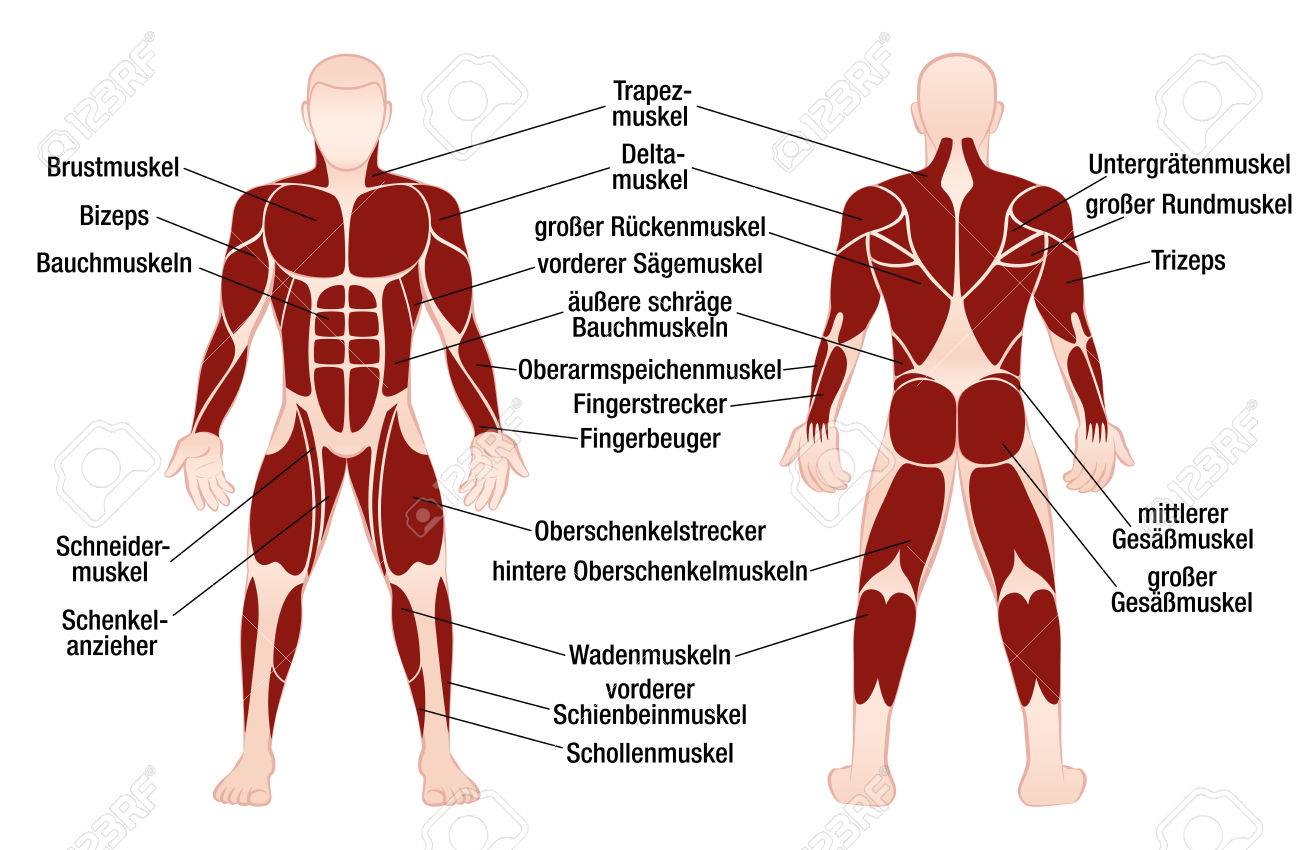 Muskel-Diagramm Mit Deutschen Beschreibung Der Wichtigsten Muskeln Des Menschlichen Körpers - Vorder-und Rückansicht - Isoliert Vektor-Illustration Auf Weißem Hintergrund. Lizenzfrei nutzbare SVG, Vektorgrafiken, Clip Arts, Illustrationen. Image 82065568.
