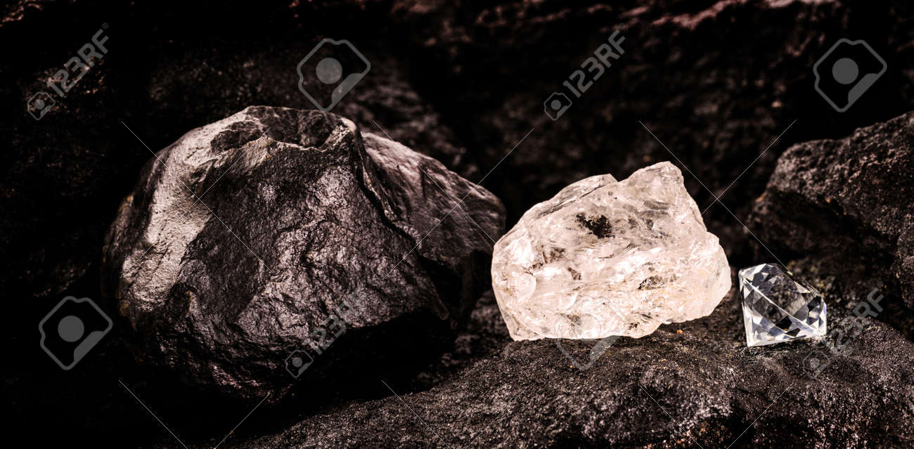 Diamantmine Mit Rauem Diamantstein, Geschliffenem Diamant Und Kohlenstoff- Oder Graphiterz, Auf Kimberlitfelsen, Umwandlung In Ein Seltenes Steinkonzept Lizenzfreie Fotos, Bilder und Stock Fotografie. Image 170182387.