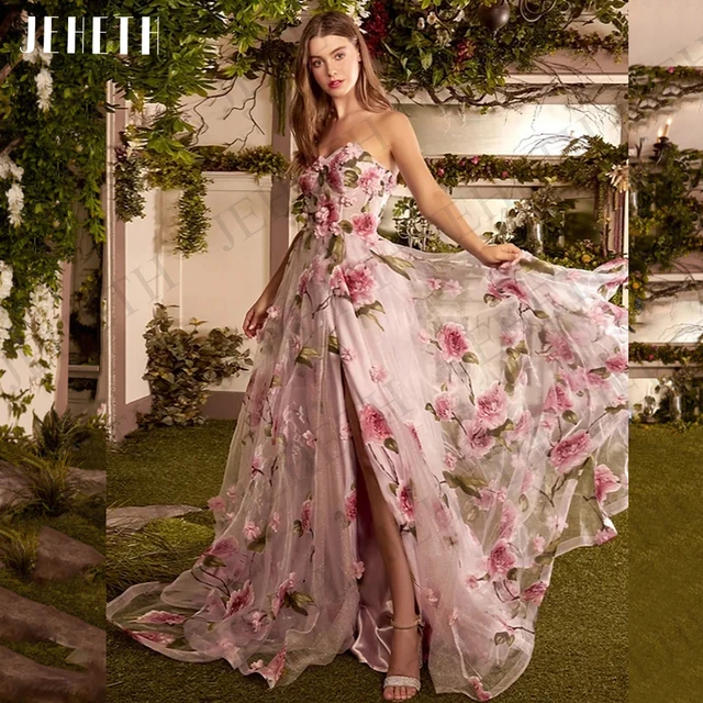Jeheth Ballkleider für Frauen 2023 rosa Blumen druck Split Party elegant träger los eine Linie Abendkleid