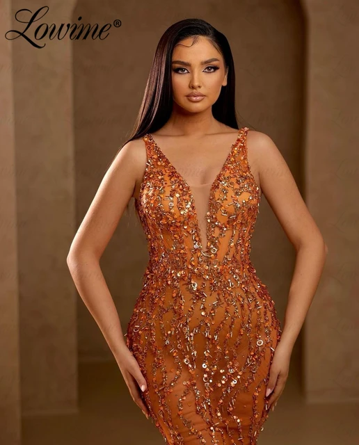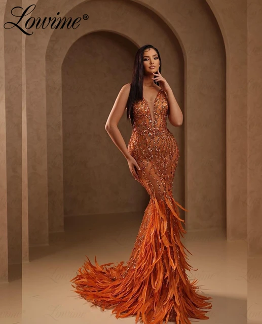 Dubai Federn orange Abendkleider V-Ausschnitt lange Ballkleider arabische Abendkleider für Frauen Hochzeits feier Perlen Kristalle - AliExpress