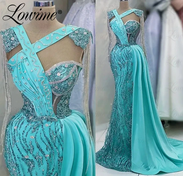 Wunderschöne blaue Meerjungfrau Halfter Ballkleider Kristall Pailletten Feder Abendkleider Seite geteilt maßge schneiderte Robe de Soirée - AliExpress