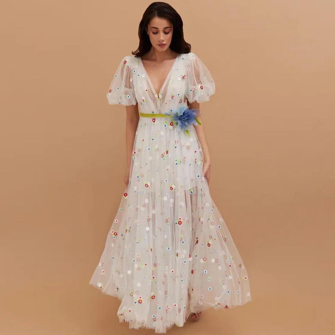 Durchsichtiges weißes Sommerkleid A-Linie boden langes Abendkleid Kurzarm Stickerei Blumen Ballkleider nach Maß - AliExpress