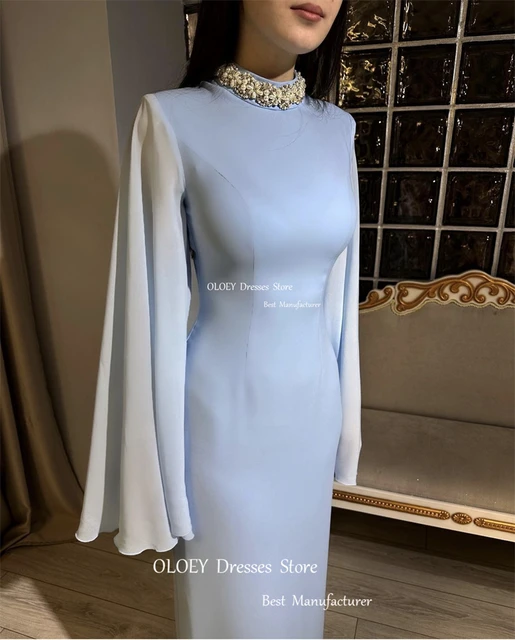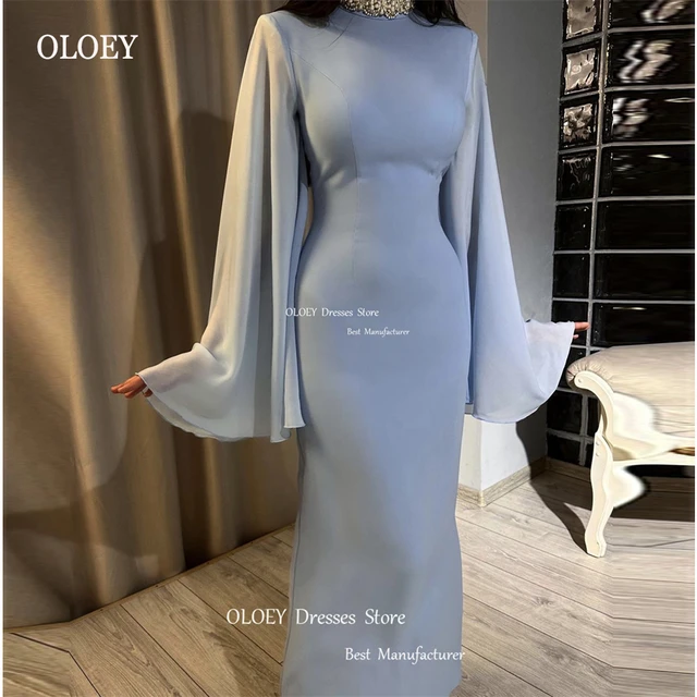 Oloey bescheidene staubige blaue arabische Frauen Abendkleider Scheide Flare lange Ärmel Kristall High Neck formelle Gelegenheit Ballkleider - AliExpress