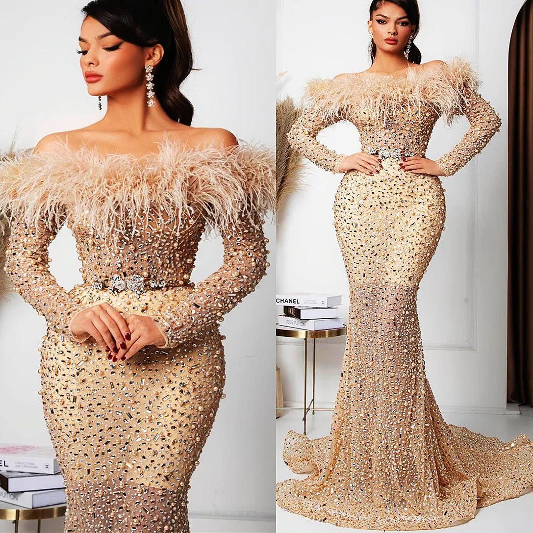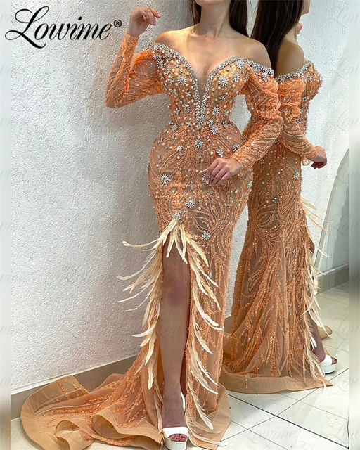 Orange Federn Ballkleider Meerjungfrau lange Ärmel von der Schulter Abendkleider maßge schneiderte geteilte Seite Kristall Pailletten Party kleider - AliExpress