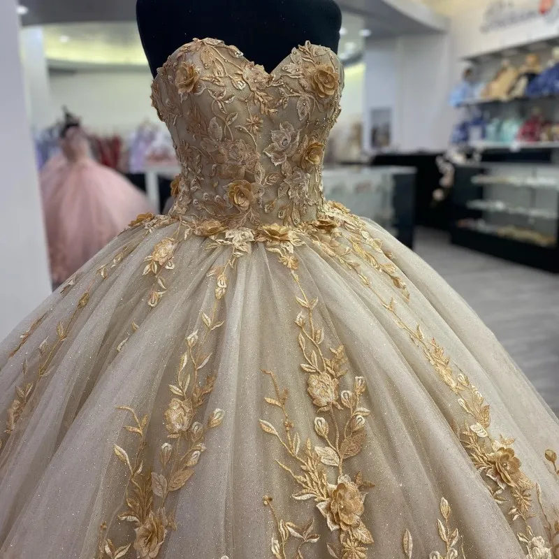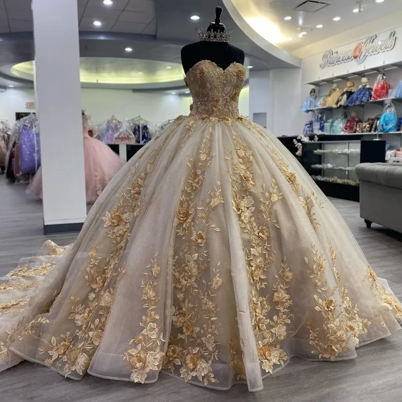 Champagne Yellow Gold Quinceanera Dresses With Appliques, Sweetheart Neckline, 3D Flowers, And Elegant Tulle Skirt Perfect For Graduation And Princess Inspired Ballkleider In 2023 From Zaomeng321, $273.69 | DHgate.Com