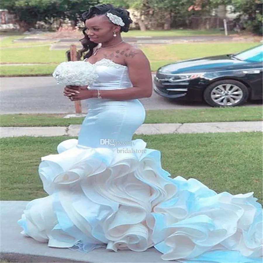 Himmelblaue Meerjungfrau Ballkleider Neck holder V-Ausschnitt mehr schicht ige Rüschen Abendkleid maßge schneiderte Spitze Applikationen Boden Party kleid - AliExpress