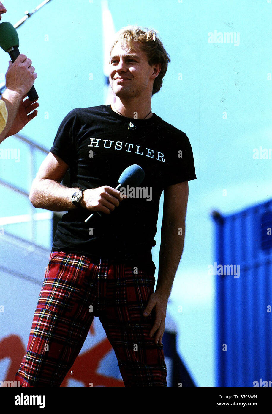 Jason Donovan at Radio 1 roadshow Irvine beach park black t shirt ...