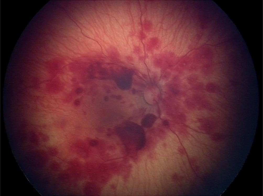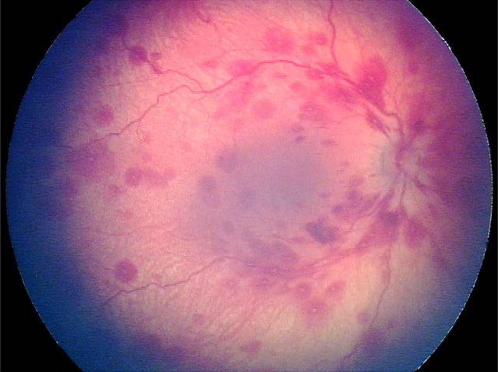A, b) Dilated fundus examination at presentation revealed moderate ...