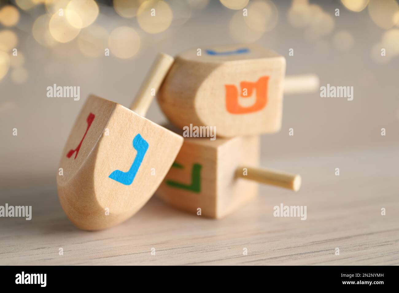 Hanukkah traditional dreidel with letters Nun and Gimel on wooden table, closeup Stock Photo - Alamy