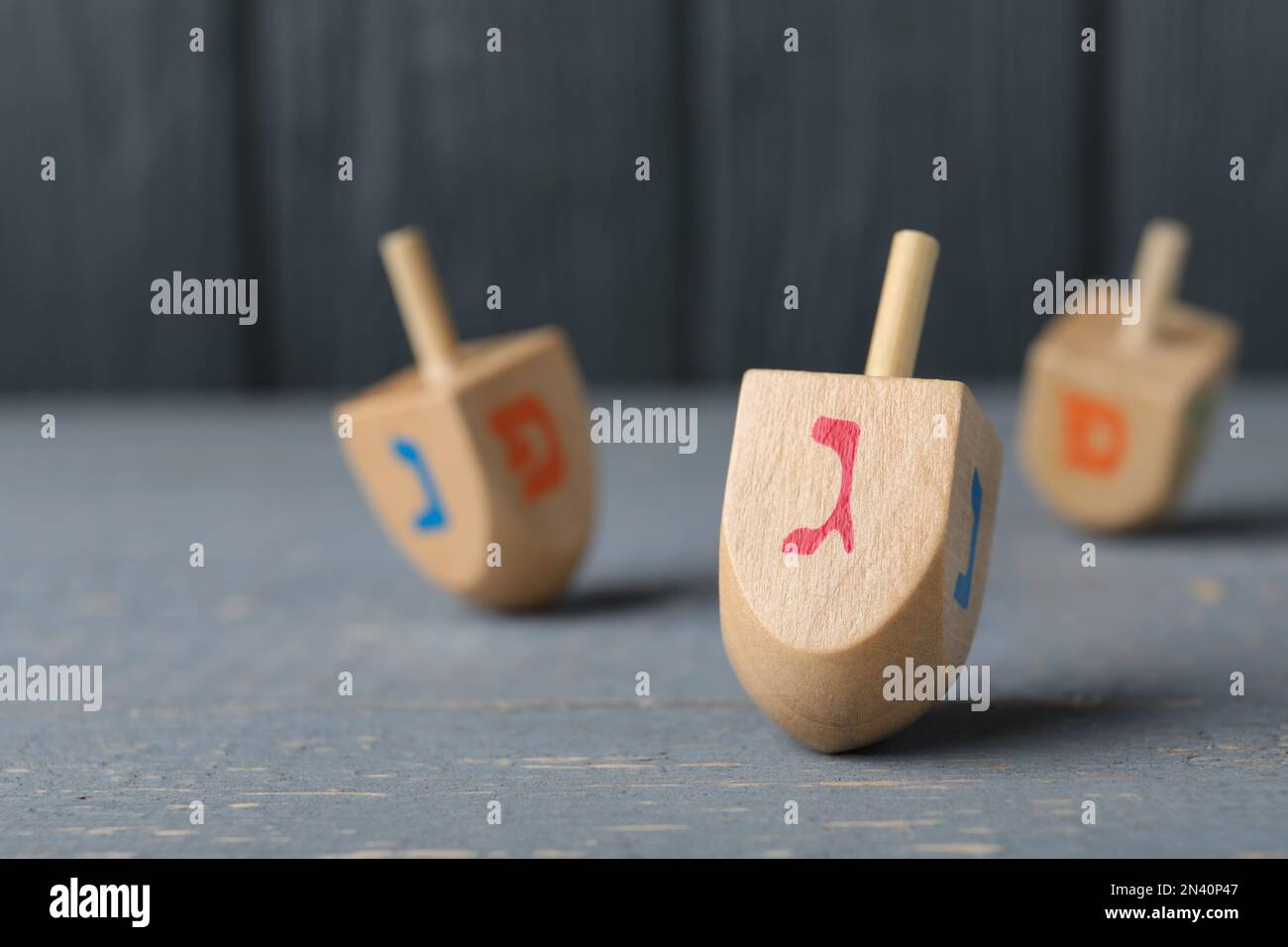Hanukkah traditional dreidel with letter Gimel on grey wooden table, closeup. Space for text Stock Photo - Alamy