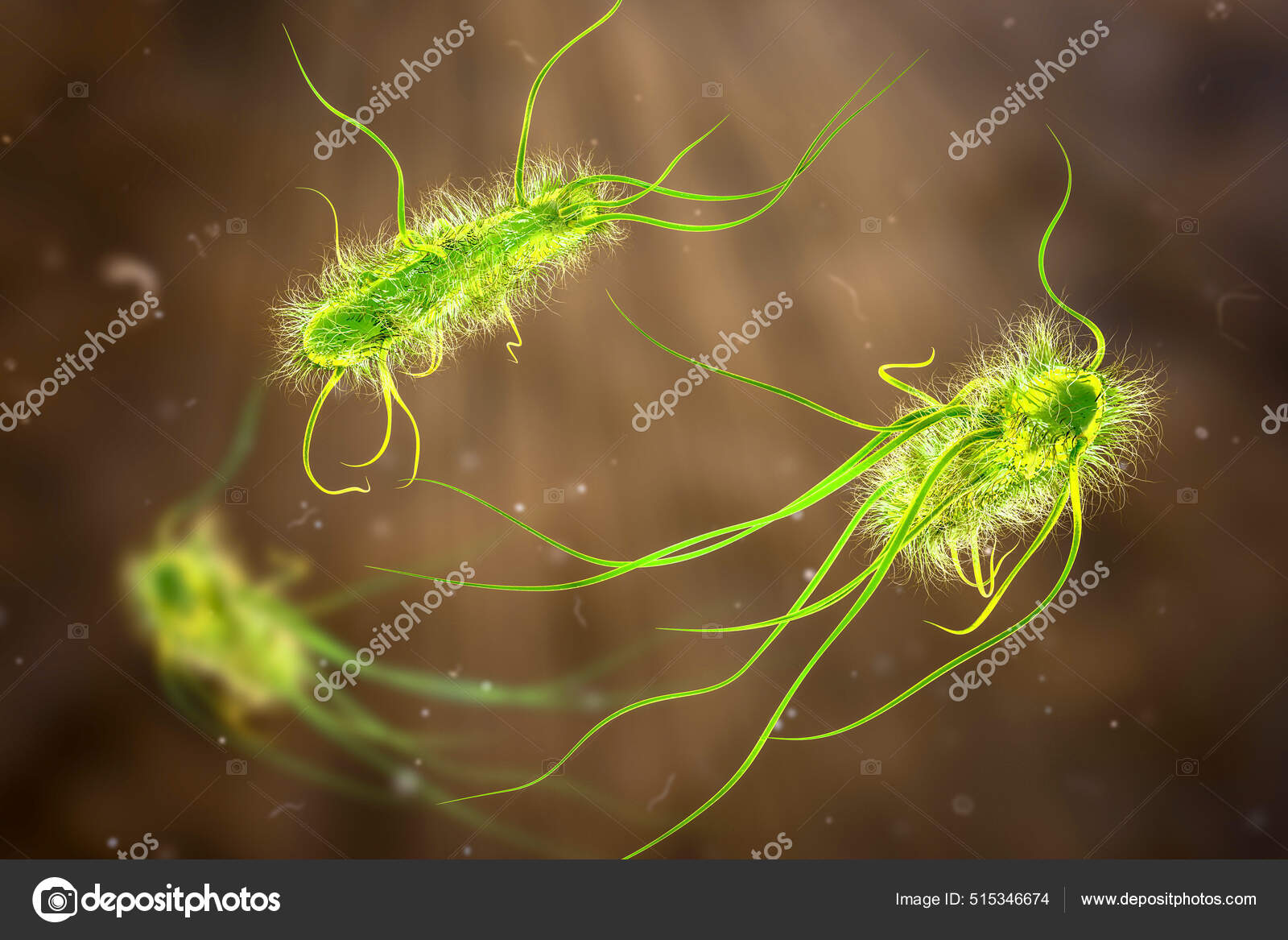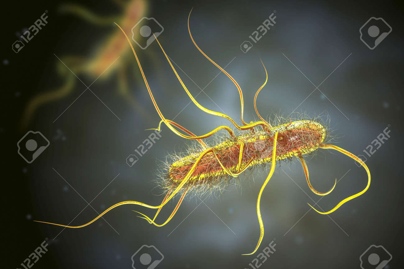 Escherichia Coli-Bakterien, 3D-Darstellung. E. Coli Ist Ein Gramnegatives, Stäbchenförmiges, Bewegliches Bakterium, Das Mit Flagellen Bedeckt Ist Lizenzfreie Fotos, Bilder und Stock Fotografie. Image 177151702.